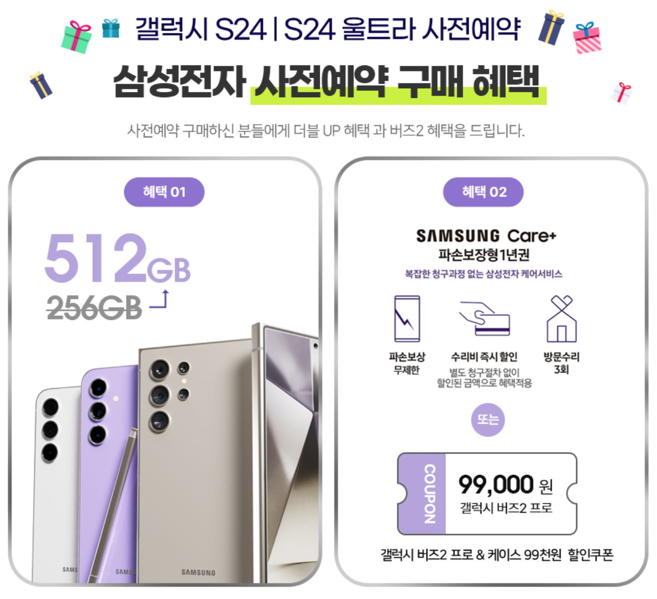 따라서 갤럭시S24 울트라 512GB 사전 구매 고객은 저장용량을 1TB로 업그레이드받을 수 있습니다. 또한 파손 보상, 수리비 즉시 할인, 방문 수리 서비스로 제품을 안심하고 사용할 수 있는 ‘삼성케어플러스 파손 보장형’ 1년권 또는 ‘갤럭시 버즈2 프로와 버즈 케이스 랜덤 1종’을 9만9천원에 구매할 수 있는 쿠폰 중 하나를 고객 선택에 따라 제공해 드립니다.